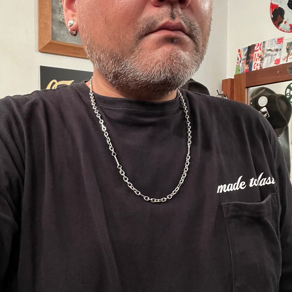 形の違うパーツをシルバーチェーンに組み込んだネックレスのカスタム品になります。